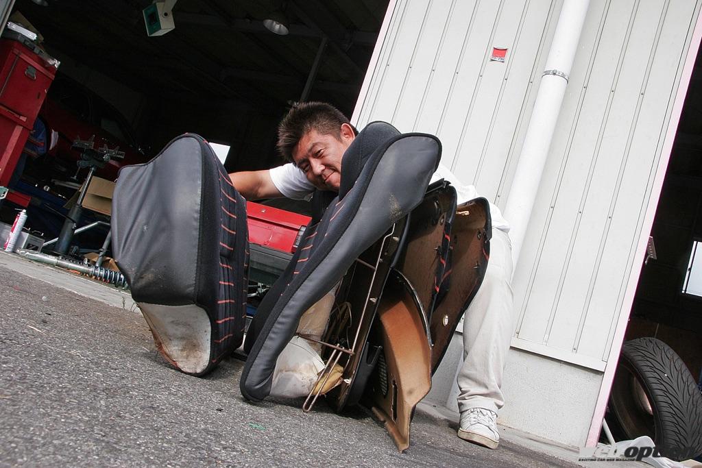 前後シートが取り外された室内。内装剥ぎ取りといったあからさまな軽量化は行わず、アンダーコートやフロアカーペットなども残される。
