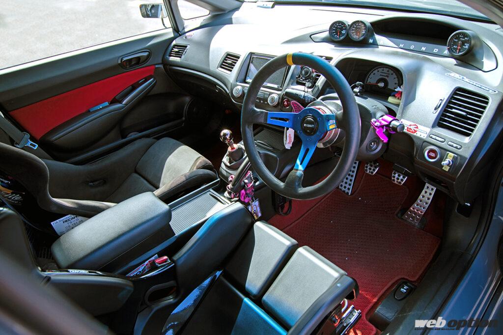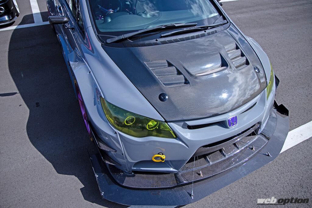 GTカーさながらの重厚なワイドフォルムが特徴のボディキットはM&M製。FD2シビックでGTルックのエアロがあまりなく、唯一見つけたのがM&Mのこのワイドボディキットだったそうだ。