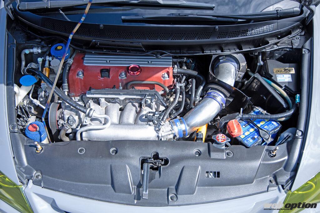 エンジンチューンも抜かりはなく、百式自動車のラジエターやシーカーの軽量プーリー、ジェイズレーシングのエンジントルクダンパーなどでファインチューン。ジェイズレーシングのハイパーECUで現車合せすることで最高出力は実測235psを発揮するという。