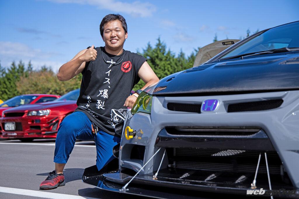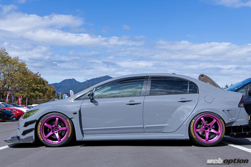 スーパーGT2017シリーズ参戦のアウディGT300マシン「Hitotsuyama Audi R8 LMS」と同じボディカラーで身を包んだ中沢さんのFD2型シビック。シックなボディカラーと過激なワイドボディで、GTカールックに仕上げたスタイリングは迫力満点だ。