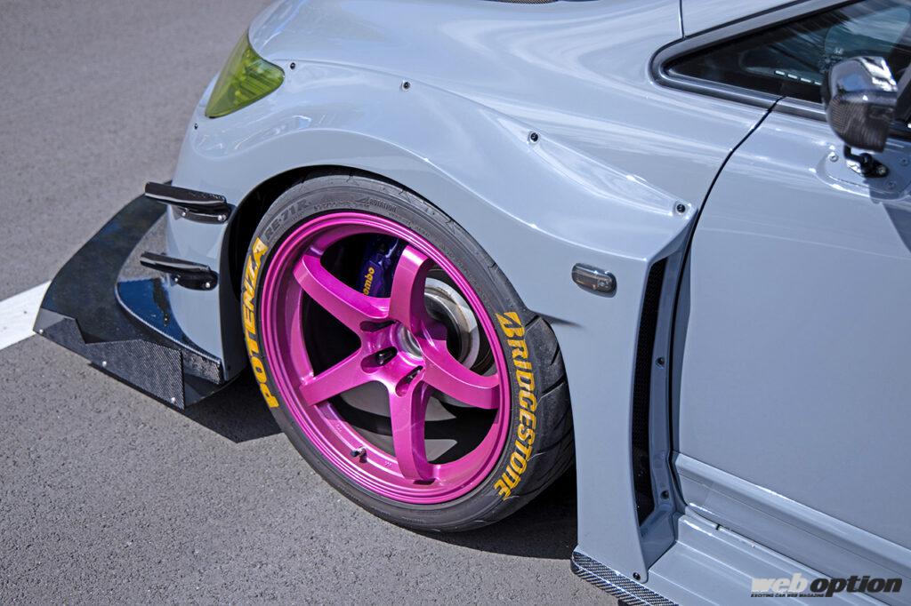 シックなナルドグレーのボディカラーに、差し色として取り入れたピンクのホイールが存在感を主張する。サイズは前後とも10.5J×15の18インチで、タイヤは295/30幅という極太サイズがすっぽりと収まる。