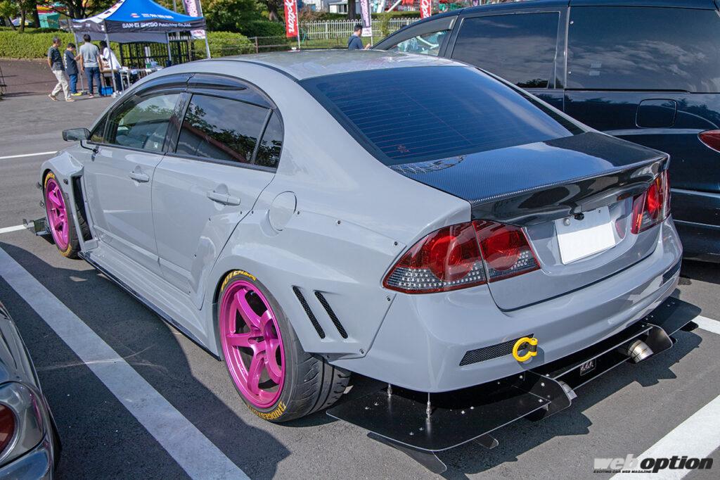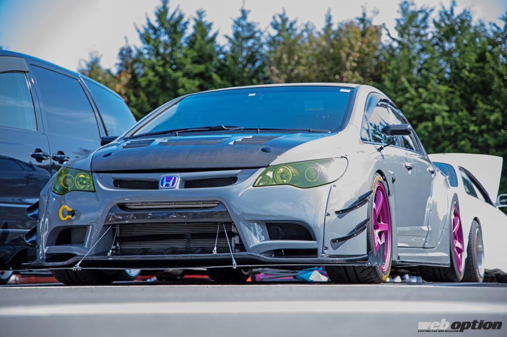 「鈑金屋から上がってきて2週間、このボディが完成してから初参加のイベントです!アウディのGTカーに憧れて同じボディカラーにしちゃいました。部分的に取り入れたカーボンもレーシーでしょ! あと奇抜カラーリングのホイールもお気に入りです」とはオーナーの中沢さん。完成したばかりということでボディもピカピカ、GTルックのFD2シビックは目立ち度満点だ。(W-Option JAMBOREEより)