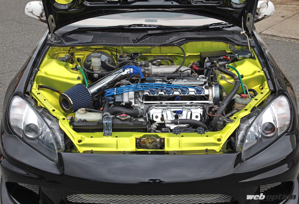 元々は1.5Lユニットを搭載するEG4シビック。このマシンではUS仕様を意識し、アメリカでのシビック・ハッチバックのスポーツグレードとなる1.6LのD16Aユニットを換装。さらにヘッドカバーやEXマニカバーにメッキ加工を、マスターバックやヒューズボックスなどの樹脂部品にはラップペイントを施している。