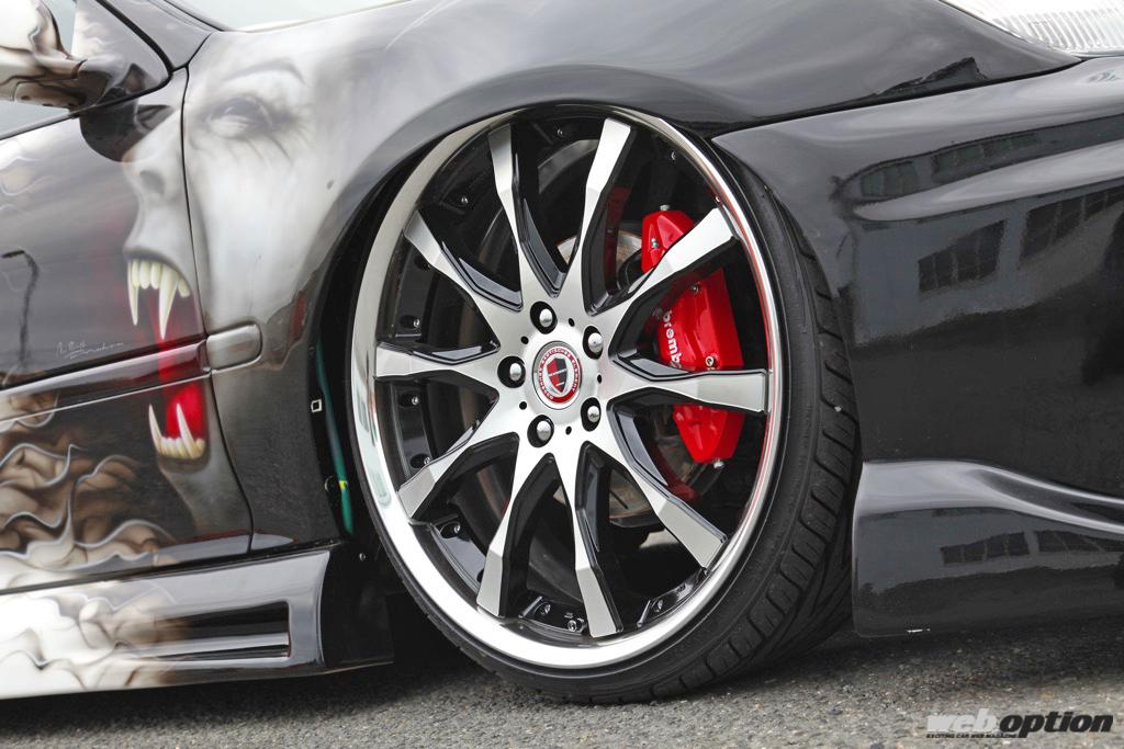 フェンダー内のフレームへの干渉を避けるためにボディ加工を施した上、ワーク・ヴァリアンツァ・シュヴァートの20インチをセット(8.0J+50)。ナックルごとEK9のハブを移植することでホイールの選択肢が広がり、ブレーキの4輪ディスク化も実現した。車高はキャノーバの特注エアサスにより、4輪独立制御が可能になっている。