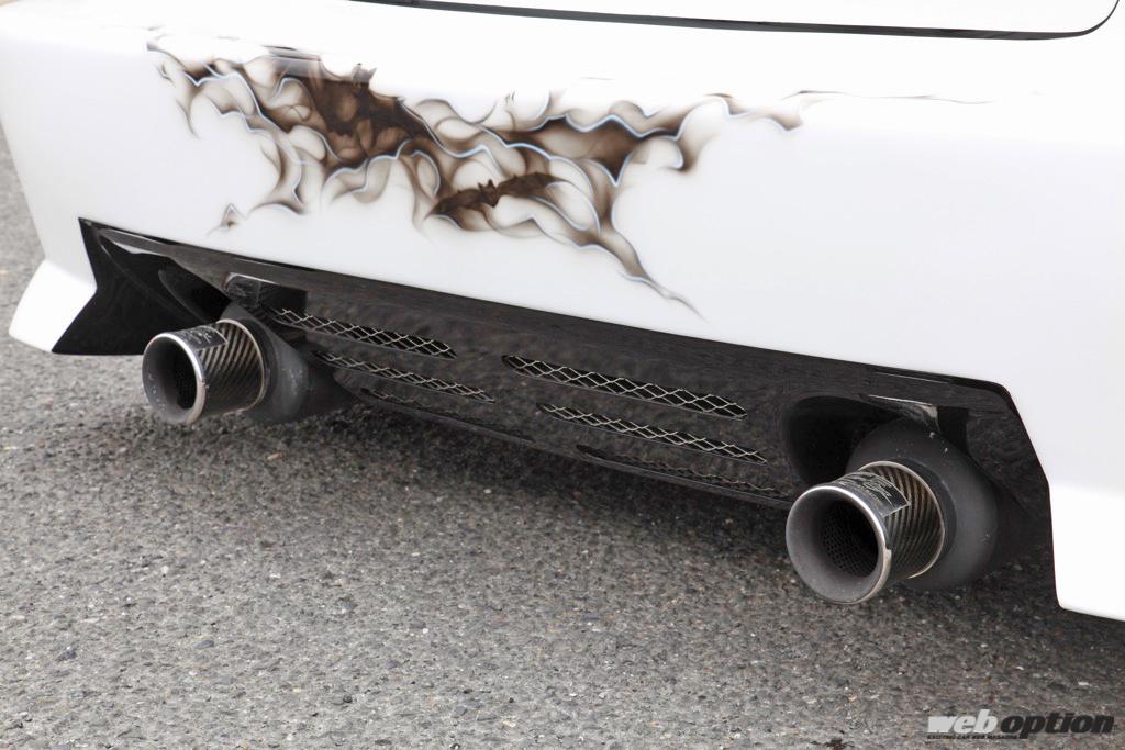 リヤはティアラのバンパーを塗り分け、ディフューザー風にアレンジ。ダクトの奥には、アンダーネオンが組み込まれナイトシーンでは妖しくライトアップする。ちなみに左右出しのマフラーもティアラ製で、テールエンドにカーボンを採用する。