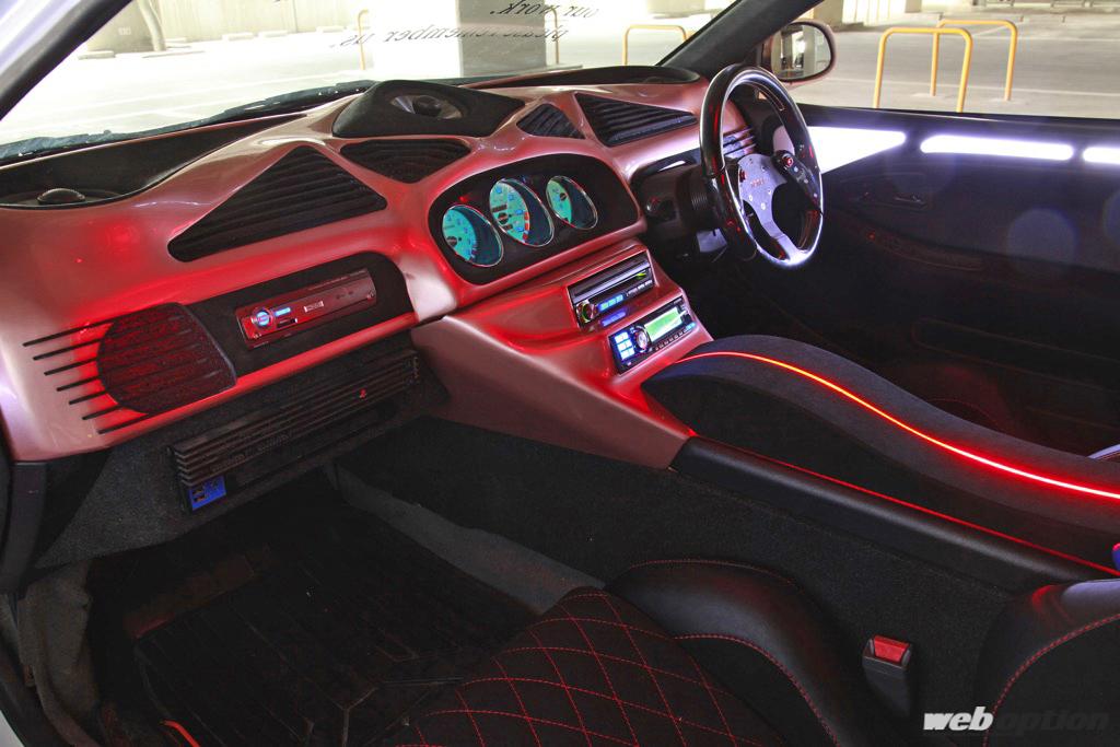 センターメーター化されたコクピットは、幻想的な雰囲気だ。ダッシュボードは、センターコンソールを軸に両サイドへと広がっていくシンメトリーデザインを採用。それを実現するためにセンターコンソールを脱着式に変更し、ATのシフトレバーを隠してしまったほどの入魂ぶり。