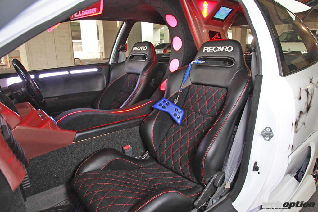 センターコンソールをルーフまで延長させることで、左右が独立した空間を演出。その左右には上質なレザーに張り替えたレカロSRIIIをセット。座面と背面にバックスキンを張り込み、ダイヤモンドステッチで仕上げたゴージャスなデザイン。