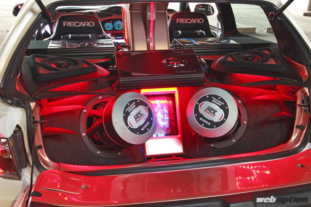 10インチ×2基のウーファーをはじめ、アンプやスピーカーなどMTX製のユニットでまとめあげたオーディオシステム。また、中央に柱を設けることによってリヤスペースでも左右対称のデザインと空間の広がりを強調しているのだ。