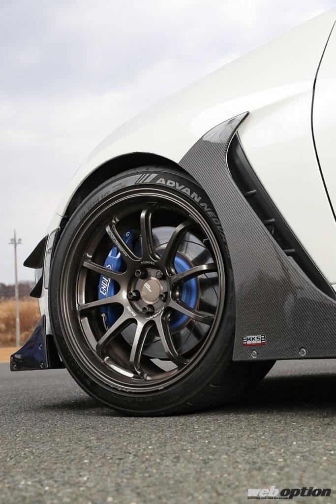 ホイールは18インチのアドバンレーシングRS-DFで、タイヤには255/35R18サイズのアドバンネオバAD09を組み合わせる。サスペンションは、サーキット向けのHKSハイパーマックスR(F9kg/mm R10kg/mm)だ。LSDはTRDの2WAY、ファイナルはノーマルの4.1となる。