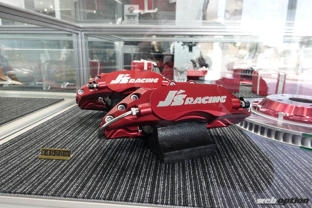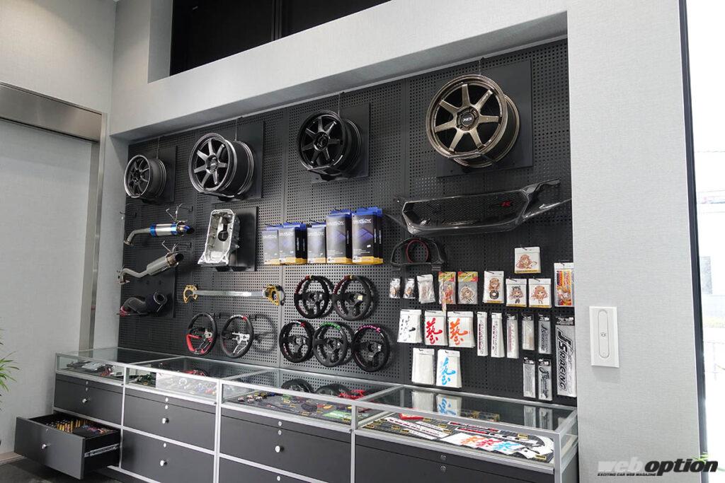 ジェイズレーシングが展開するオリジナルパーツやグッズ類も、ブティックさながらの魅せるレイアウトで演出。ホイールやブレーキシステム、サスペンション、マフラー、そしてスケールモデル等々…量販店レベルの展示量だ。