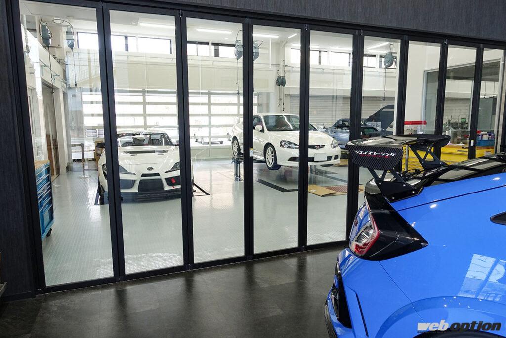 店舗の外観は、まるで高級輸入車ディーラーかのような佇まい。この社屋は決して居抜きなどではなく、ジェイズレーシングとしての活動をより飛躍させるべくデザインされた完全新築とのこと。