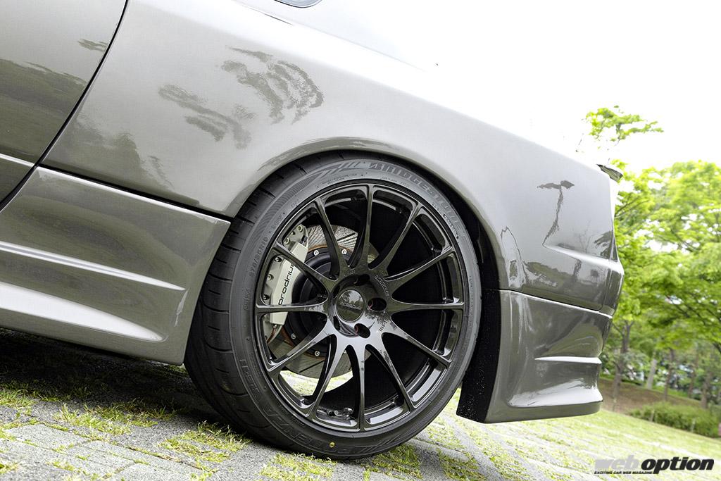 このS15シルビアのオーナーは、アフターパーツメーカーとして知られるプロドライブでホイールデザイナーを務める人物。コンセプトは、ずばり”銀座にも乗っていけるドリ車”。ボディカラーやエアロパーツのチョイスまで徹底的に拘り、大人が乗れるチューンドを目指したのだ。細部を見ていこう。